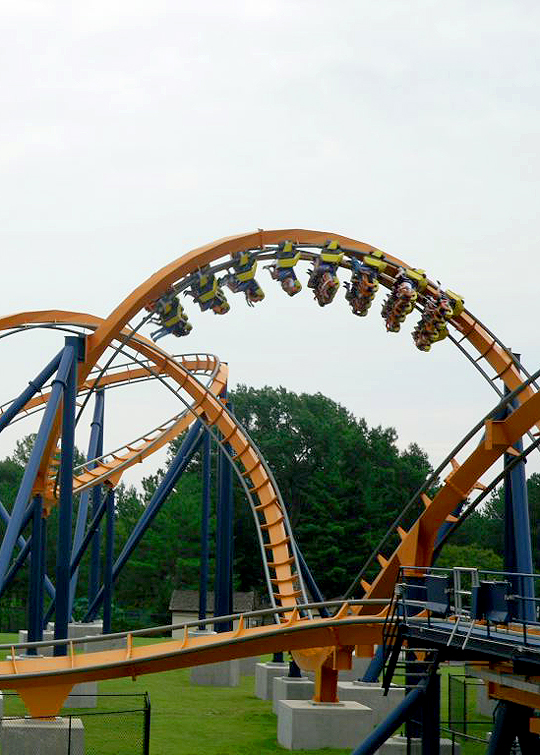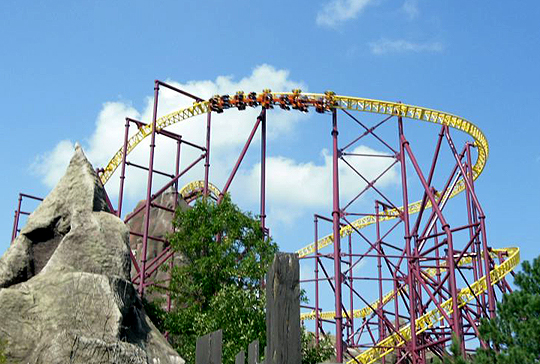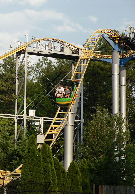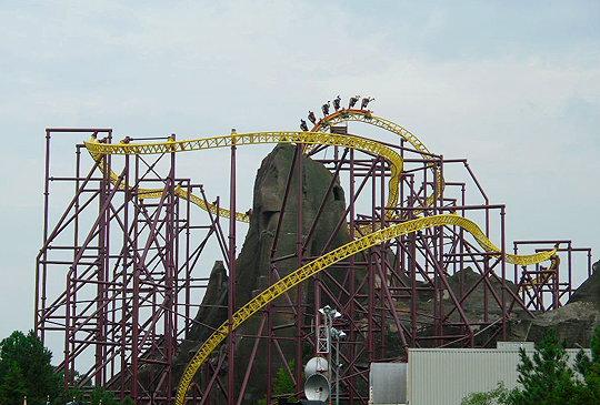 Morning ERT featured Dominator, the transplanted floorless, and Grizzly, one of the park's woodies. Grizzly was not too shabby, a little rough maybe, but fun. (Remember when there were still all those trees around it? Used to be really special...) (Also, Hurler is still not bad, but boy, do I miss the "Wayne's World" safety videos...)