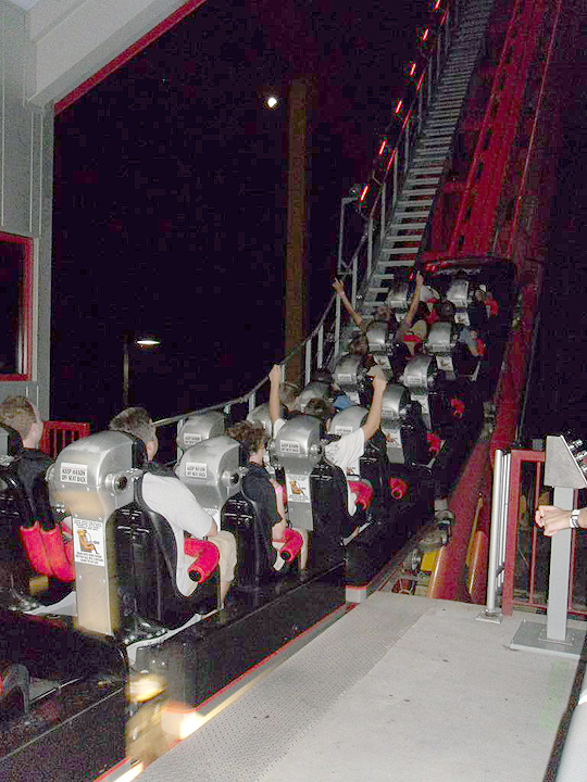 Rain picked up again for a short while, but nothing harsh enough to dampen the evening ERT on Intimidator, Volcano: The Blast Coaster and Flight of Fear with the lights on! Actually, it was riders' choice; there were literally no lines for FoF, and just before the launch, the ride ops asked if we wanted lights on or off. So we tried it both ways. Kicks royal hiney both ways.