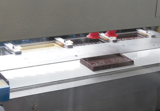 Here comes a base out of the "De-Stacker." This is a milk chocolate base, not mine.