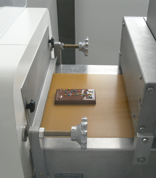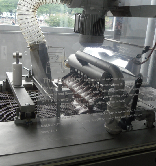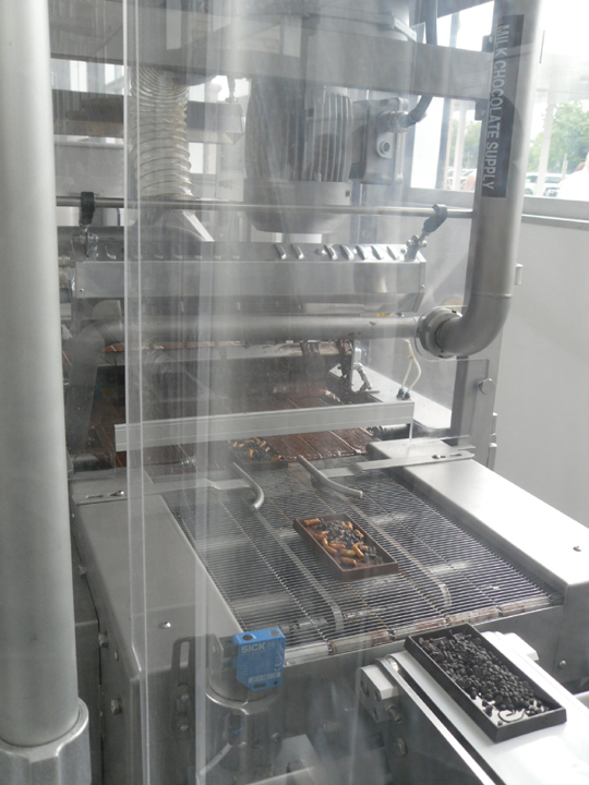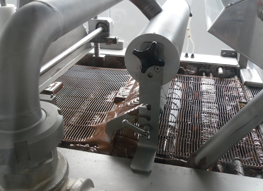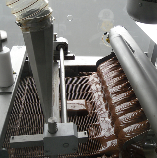 This is where the entire bar, top and bottom, gets a delectable coating of milk chocolate. Be warned: if you really love chocolate, the next couple of pictures may be hard to look at, especially if you are hungry.