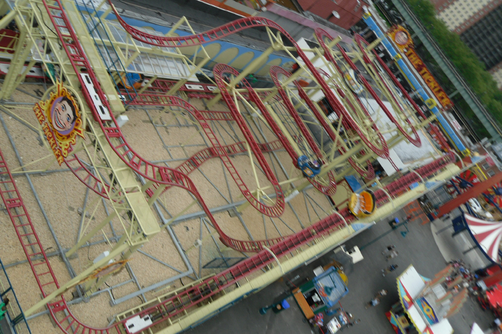 Here's a fuzzy overhead shot, taken from the Brooklyn Flyer. A pretty standard layout, but when you're twirling around like a frog in a blender, it's a hoot.