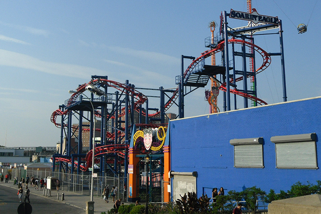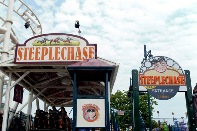 The Scream Zone machine I was compelled to sample was the Steeplechase coaster. This is one of Zamperla's stock "Moto Coasters," themed to the legendary horse-racing attraction that was Steeplechase Park's E-Ticket ride.