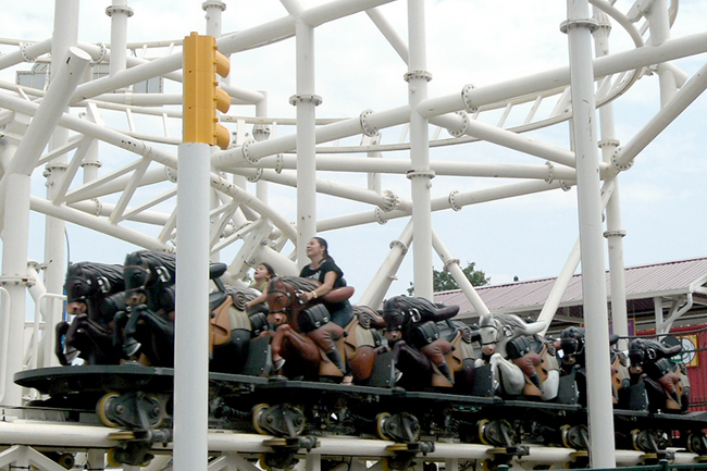 Like Knott's Berry Farm's custom Pony Express, this ride is launched, and features horsey-shaped cars which are mounted equestrian-style. The blast-off is pretty peppy!