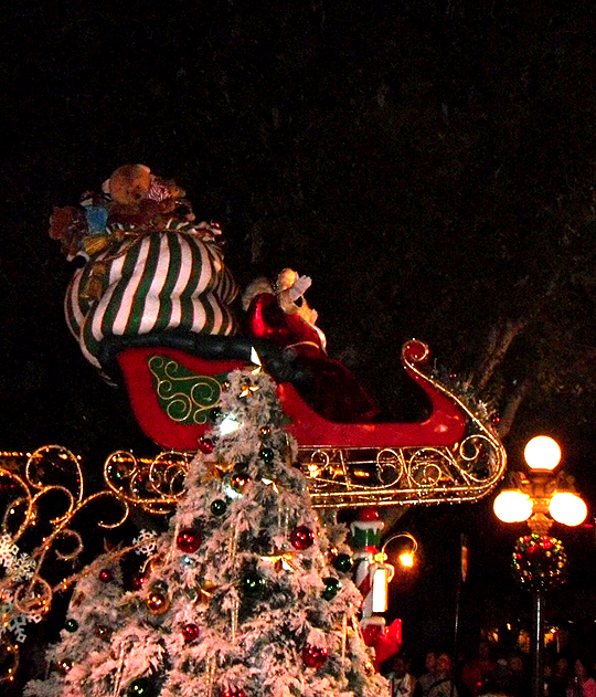 After dinner, we headed over to California Adventure, and got to see the big Christmas parade on the way out. Here's Santa, basking in the adulation of his fans. No coal in my stocking this year, so the big man and I are cool.