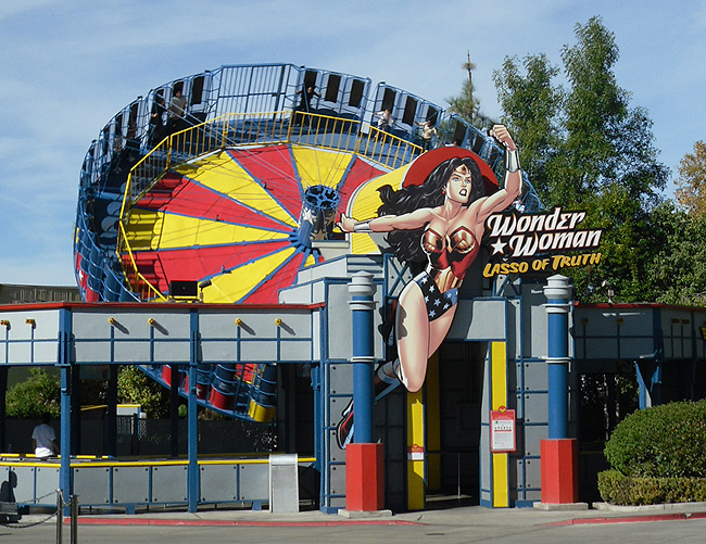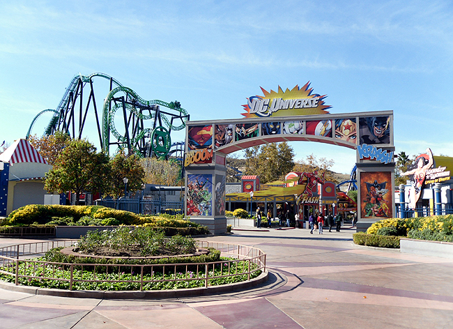 As I remarked in the West Coast Bash 2012 Day One trip report, DC Universe is a real stand-out. It looks and feels like a whole - bright, colorful, true to the comic book aesthetic. AND - this is so important - all the rides in this corner are themed to DC good guys and bad guys. Even the freaking Round-Up. That's what I expect in a "theme park," and it makes me so happy to see Magic Mountain putting in the effort.