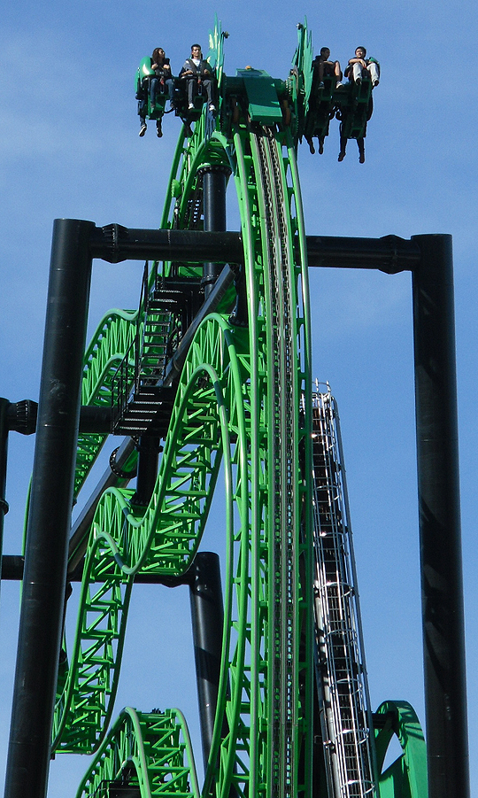 At the crest of the vertical lift, the cars unlock and we slide along the top shelf, all loosey-goosey, ready to let gravity and angular momentum work their voodoo on us. That first little dip is just a tease, a warning.