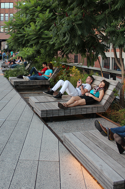 There are places to sit all along The High Line, but one section includes some prime napping stations. These wood chaise lounges face west, and with little visual obstruction, you can watch the sun set over the Hudson River.