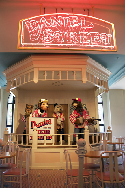 We were serenaded by "Daniel and the Dixie Diggers," a robot critter show that lies on the quality scale somewhere between Chuck E. Cheese and The Country Bear Jamboree (a lot closer to the former than the latter, but hey, animatronics rule).