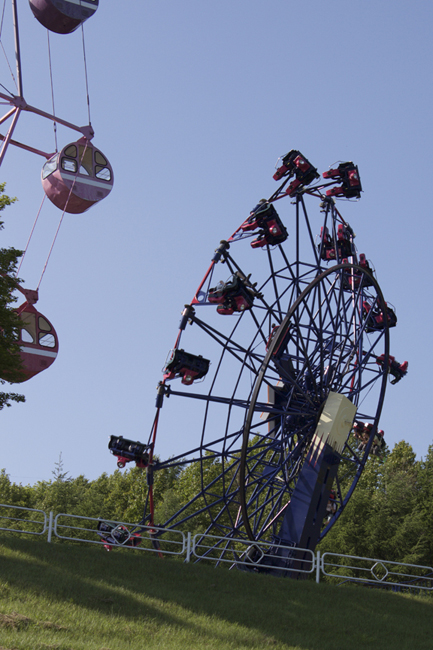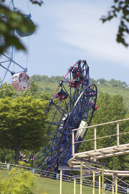 It's tricky to spot in this photo, but there's this ride called the Heartbeat, or Heartbreak, or Heartburn, Heart-something or other, to the left of the the rainbow-colored Ferris wheel. Look for the white six-pointed star, anyway, it's a Togo flat ride and it is wicked.