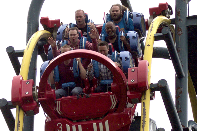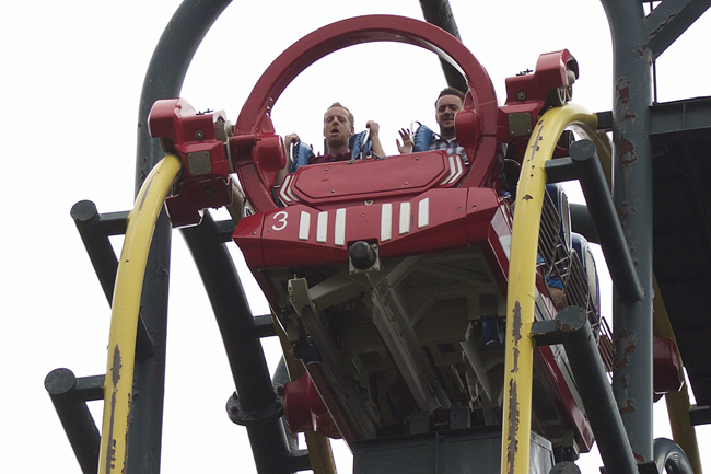 The thing that gets me jazzed for a straight-line shuttle coaster is a powered launch, be it a Schwarzkopf flywheel launch, or an Intamin Impulse LIM launch, or even Arrow's old electric winch yank. Loop the Loop, which pulls you slowly up a hill and then lets gravity do the rest of the work, is fun enough. But I was perfectly happy with a single ride. (Check out the verdant majesty in the background.)