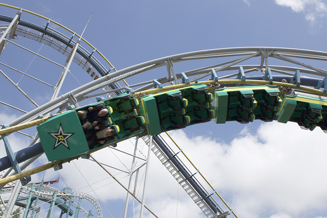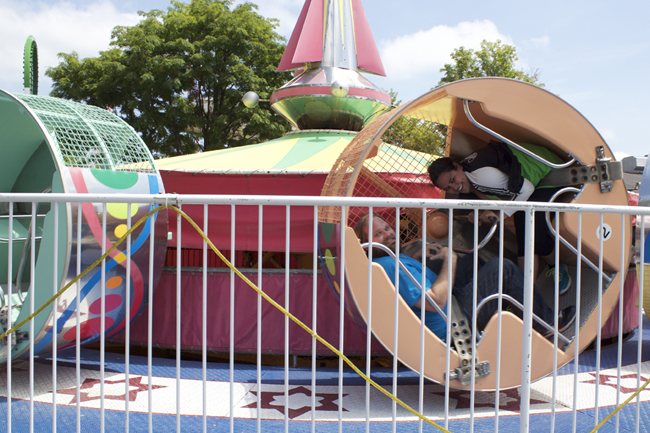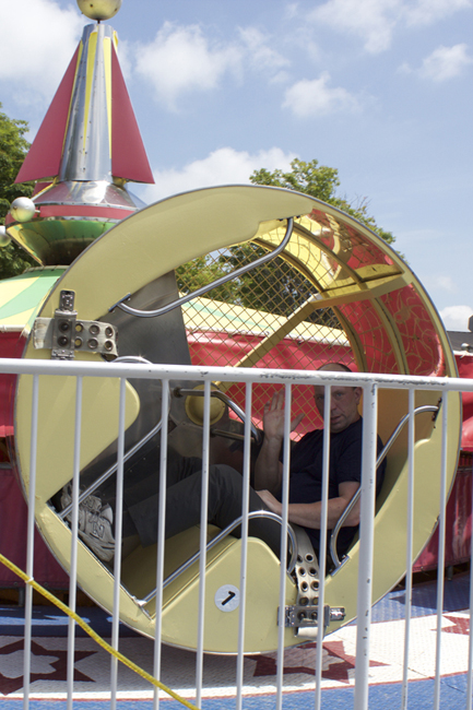 I can't remember the last time I saw one of these swing-cage deals. It must have been at a schoolyard carnival decades ago. In my opinion, they start to cross the line between "ride" and "gymnasium equipment," too much personal effort required. So I watched as Cary, Anth, Steve and Priss hopped on. Cary got way up there; I was impressed.