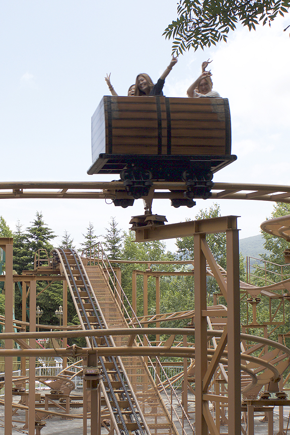 That vehicle sure looks like some kind of mine car, right? So, yeah, "Mad Mouse" is odd. And two chains to carry these little things up a hill so short seems kind of over-engineered, but what do I know? Konnichiwa, ladies! |