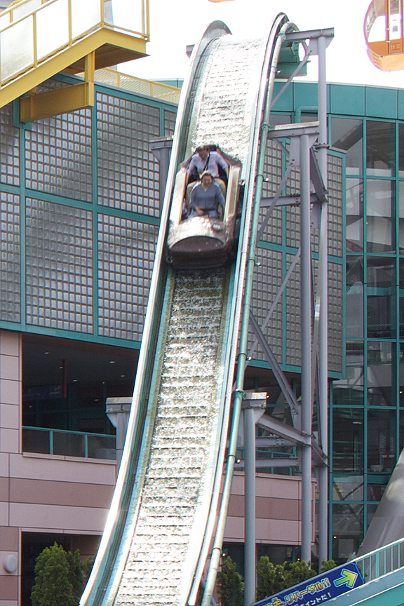 Right after Spinning Coaster, we all jumped onto Cosmo World's honked-up flume ride, seen here gliding past Dive Coaster: Vanish's signature "splashdown." I missed out on that scenic treat, and the rest of the slow meander around Cosmo World's other rides is nothing special.