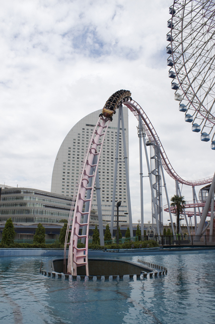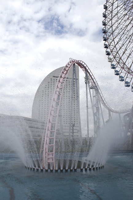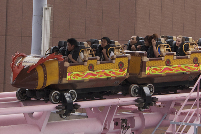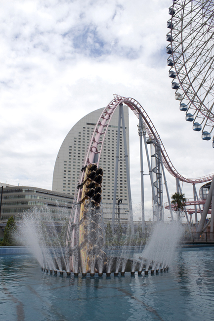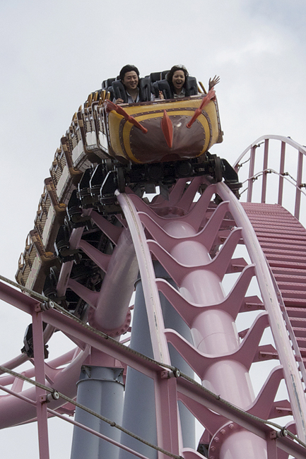 Next up was DC:V, another ride that's been high on my bucket list for so long. First, behold this train. It is aggressively, magificently wrong. Second, I love coasters that go over and tunnel beneath water, like King's Dominion's Anaconda. Third, Japan. Fourth, would you look at that glorious train-wreck of train, what the hell?!