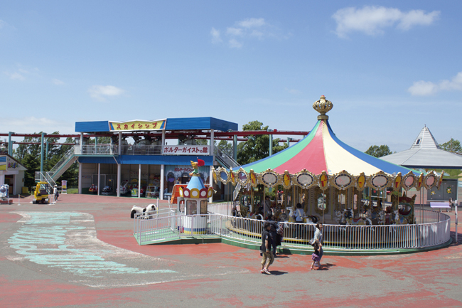 My favorite attraction at Greenland was their spooky Surprising House, which is tucked away under the station for the suspended pirate boat monorail; you can see it behind the entrance to the carousel in the photo above.