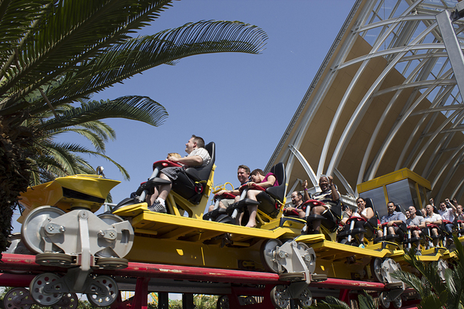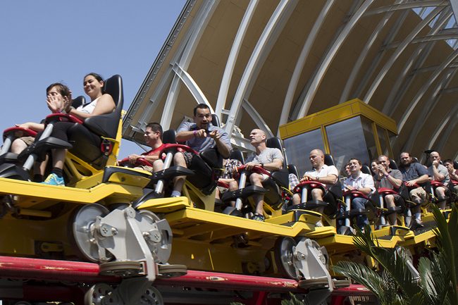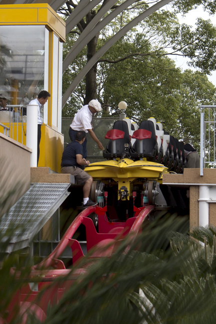 Here's Robb, who knows a thing or two about putting cameras on a roller coaster, doing his best to help move things along. Check out the snazzy lead car on the new Beemers!