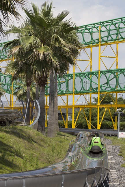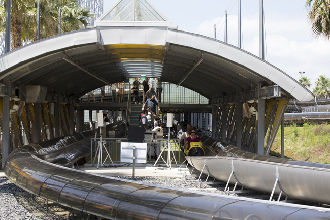 These kooky little electric-powered vehicles zip through what appear to be repurposed playground slides.