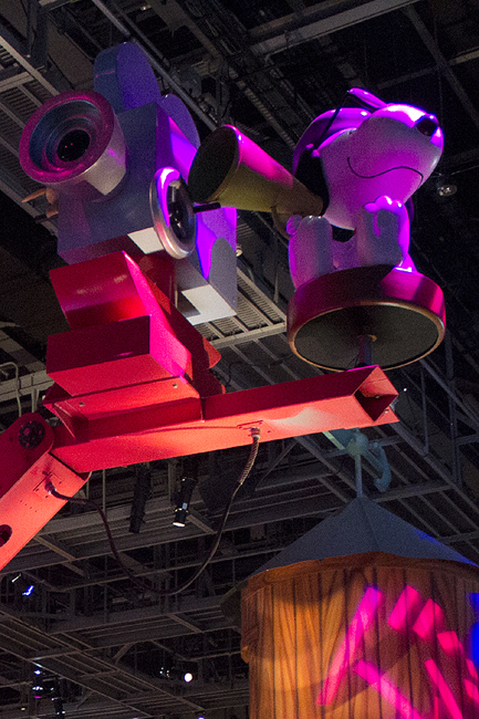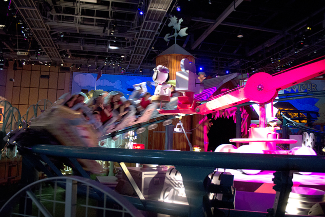 We're actually the stars – well, maybe just supporting players – in a movie Snoopy is directing. At this point, when we zoom around a curve, Snoopy gets a sweeping action shot; the camera boom actually follows us through the turn. And you can see the backside of Woodstock, operating the camera, sort of. That's some fine kiddie coaster theming.