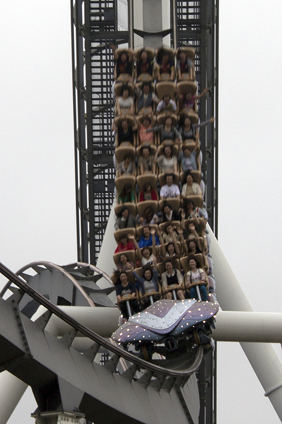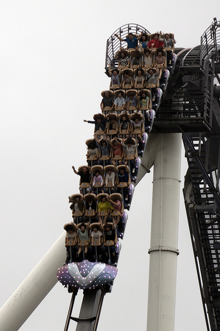 Thanks to some appropriate piece of paper in our wad of express tickets and special passes – or for some other reason I'm forgetting, anyhow – we were able to run right back around and grab another ride facing forward. Decent high jinks for sure because MUSIC + ROLLER COASTER is always equal to or greater than GOODNESS.