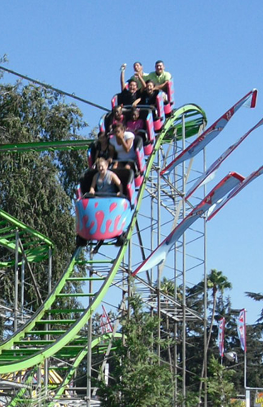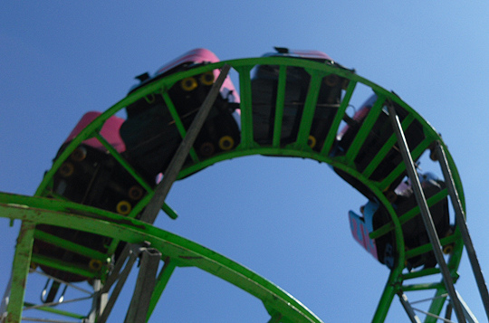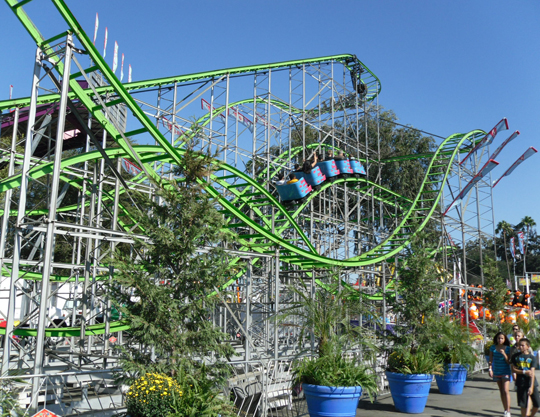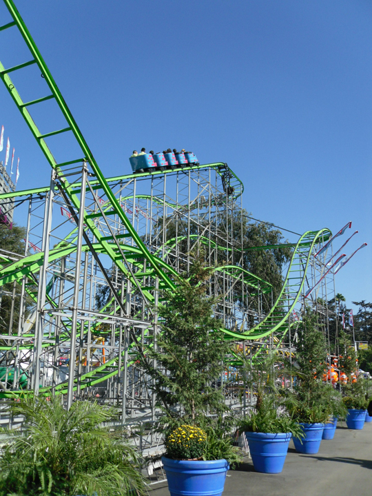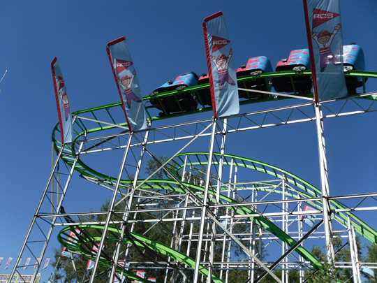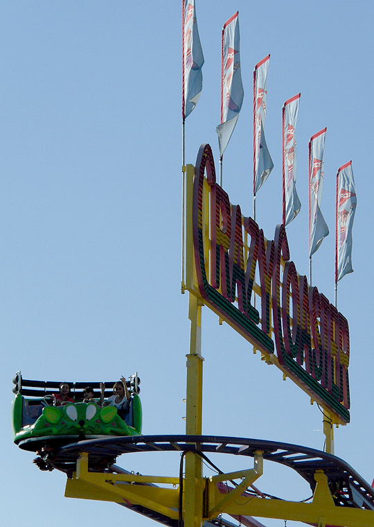 Feeling pretty macho after conquering the Starflyer, we sauntered over to the fair's major coaster, the lean green-railed machine called the Hi-Miler, from our good friends at Miler Coaster, Inc.