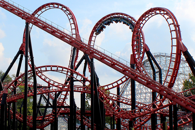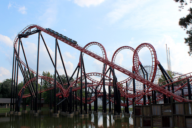 Let's forget about how Ninja rides for a second; doesn't it look totally kick-ass? All black and red, entirely built over the water, the funky geometry of those tall inversions, I dunno, maybe it's just me, but I think it's one very striking piece of work.