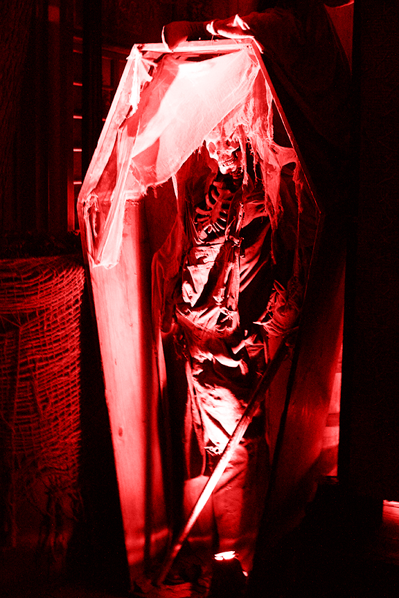 A skeleton in a coffin; YAY! (Halloween is the greatest, we're clear on that, yes?)
