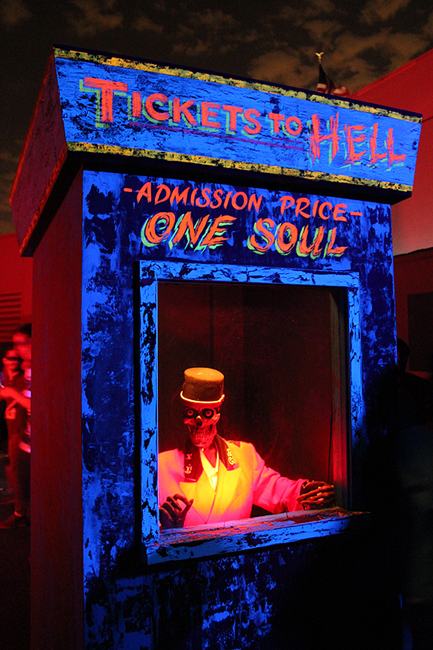 And look at this portal; SWEET. They must have emptied about a million cans of Day-Glo paint to dress this maze, and it made the "3D" effect work better than I've ever seen. And there's the rub: to really get that 3D pop, you need a lot of color and a lot of light, which sort of cuts down on the scary factor. Not a bad thing, though, when there is cool stuff to look at, and there is a lot of cool stuff to look at in here. Plus, this is a rock and roll maze, baby, and the riot of blacklight color feels appropriate.